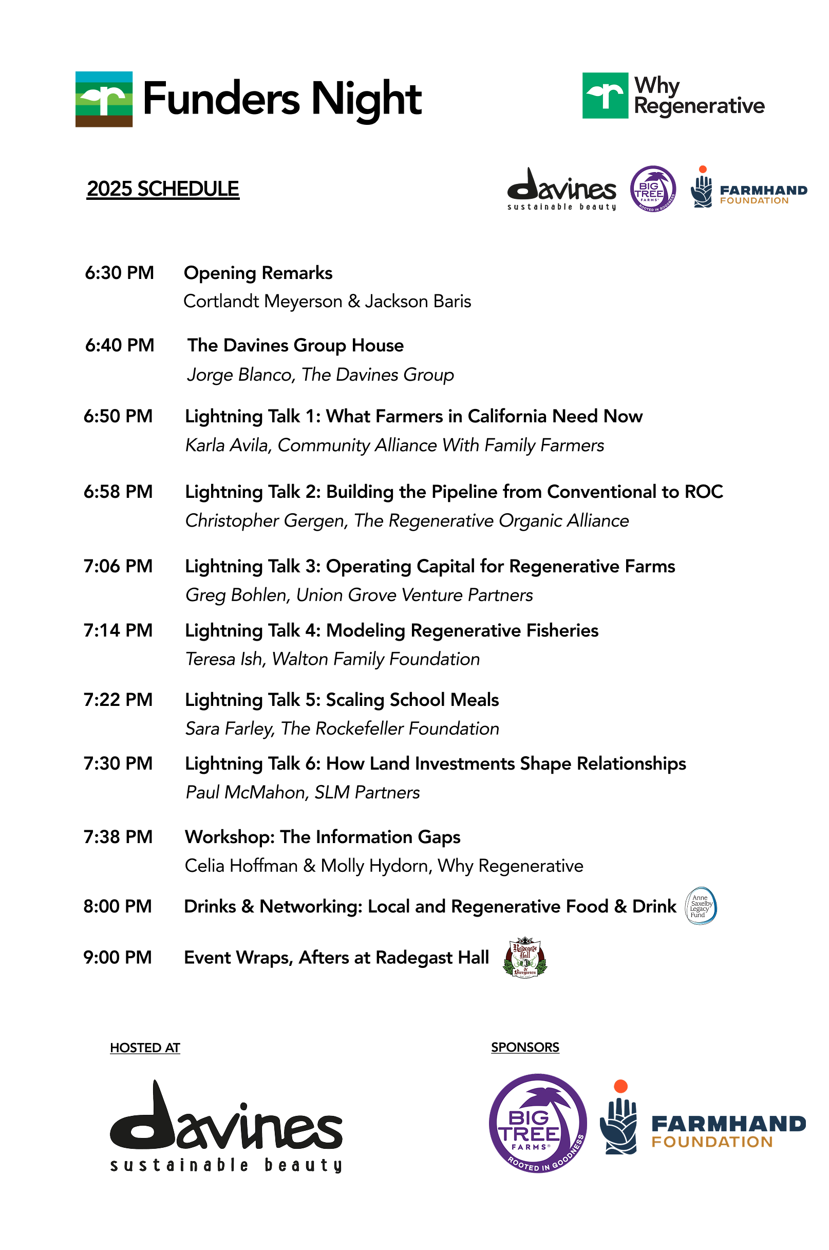 Join Why Regenerative at Davines Group House for an evening convening leaders in regenerative agriculture, philanthropy, and investment. Through lightning talks, networking, and a hands-on workshop, we’ll spark new connections and mobilize capital to accelerate the regenerative transition. Following the event will be a happy hour.