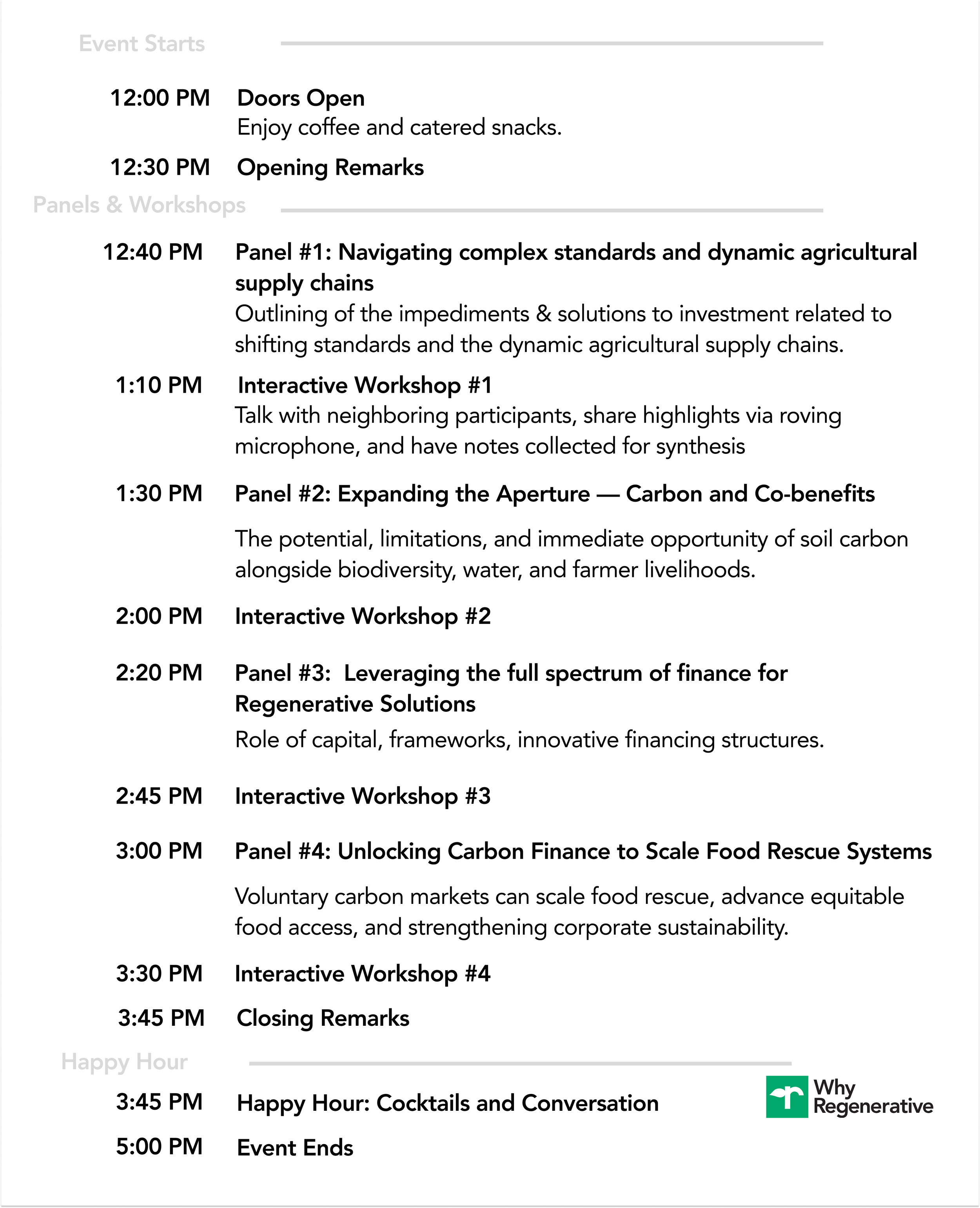 Following the sessions, there will be a happy hour with an open bar serving regenerative cocktails.